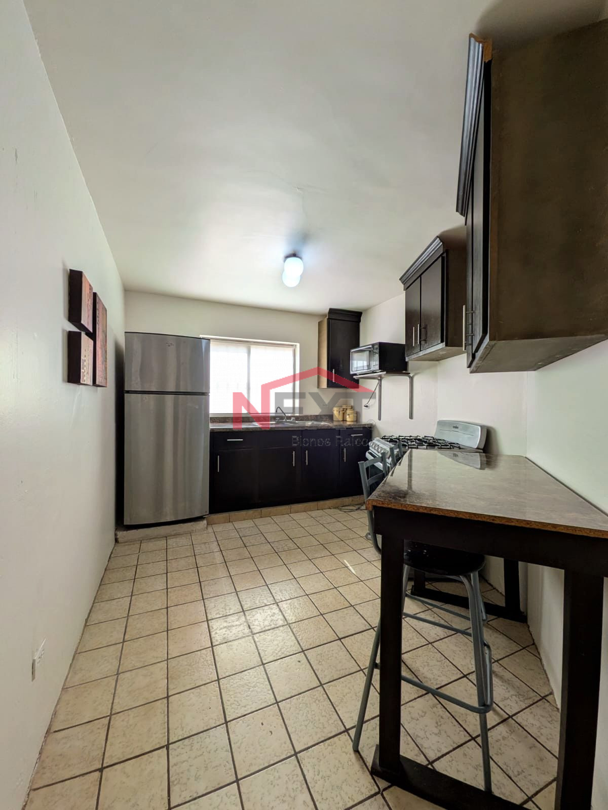 🍳 Cocina: estufa, refrigerador, microondas y 2 banquitos