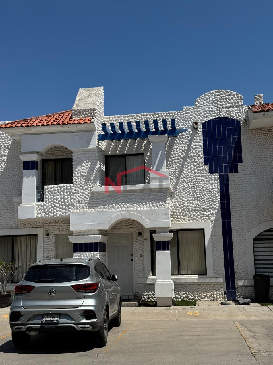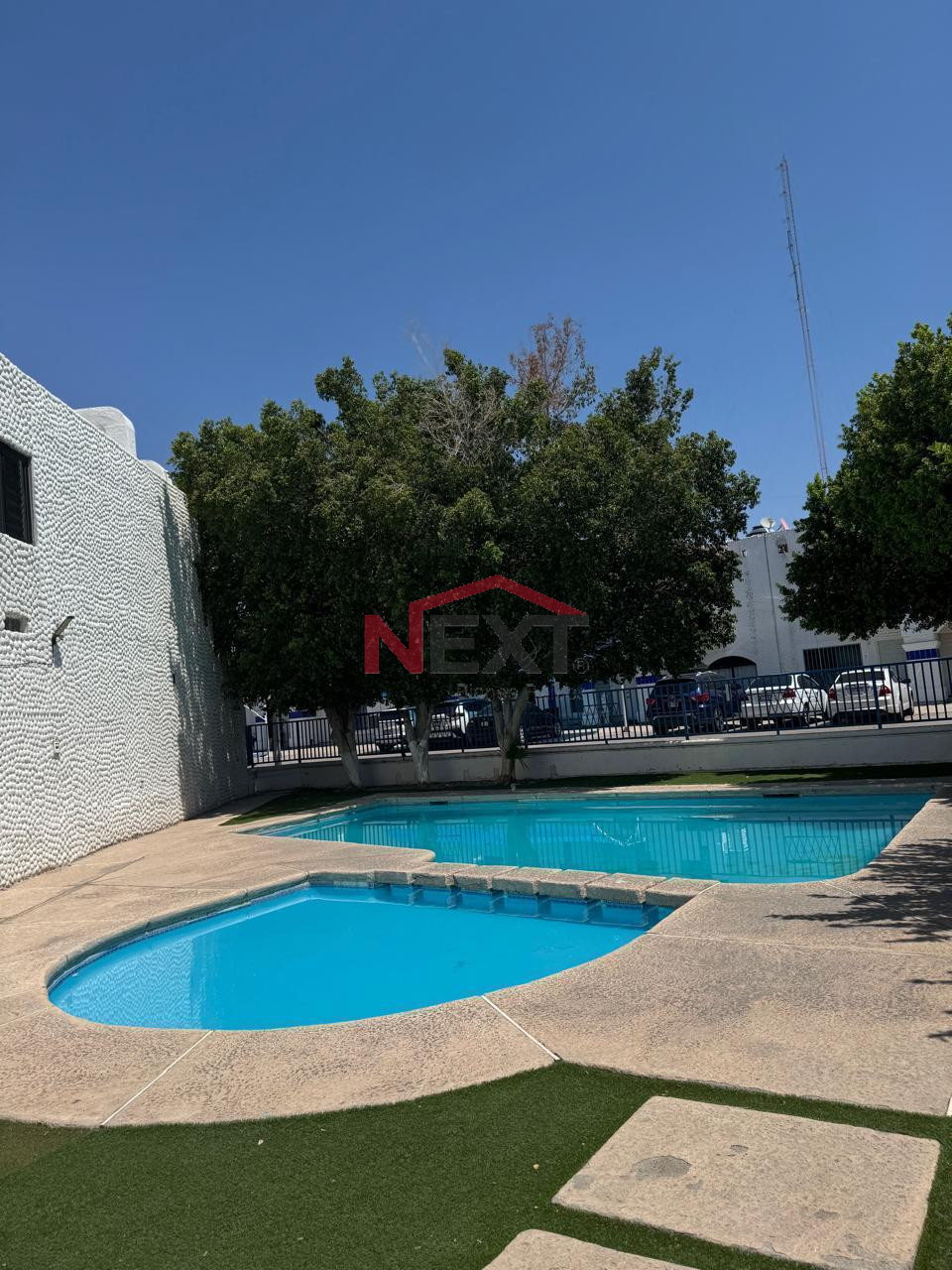 2 plantas, 2 recamaras con closets y camas, 1.5 baños, 2 autos, alberca area recreativa en la privada.