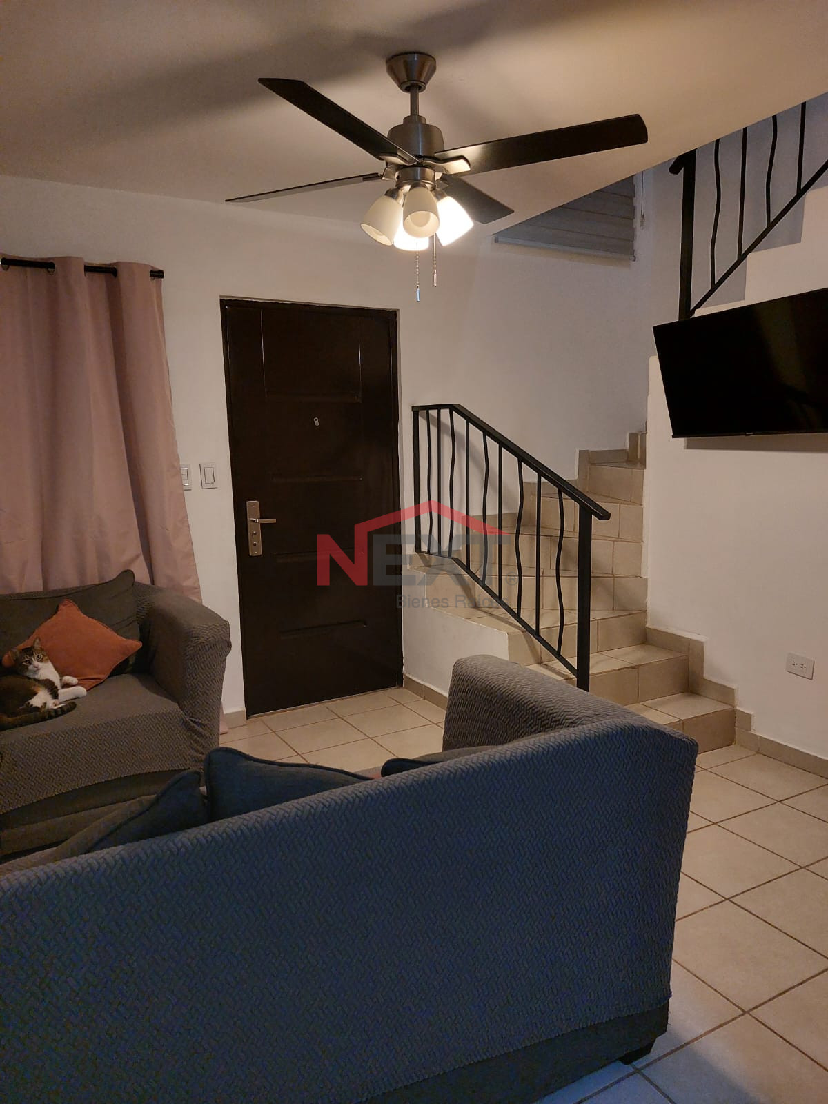 Sala con abanico de techo y televisión