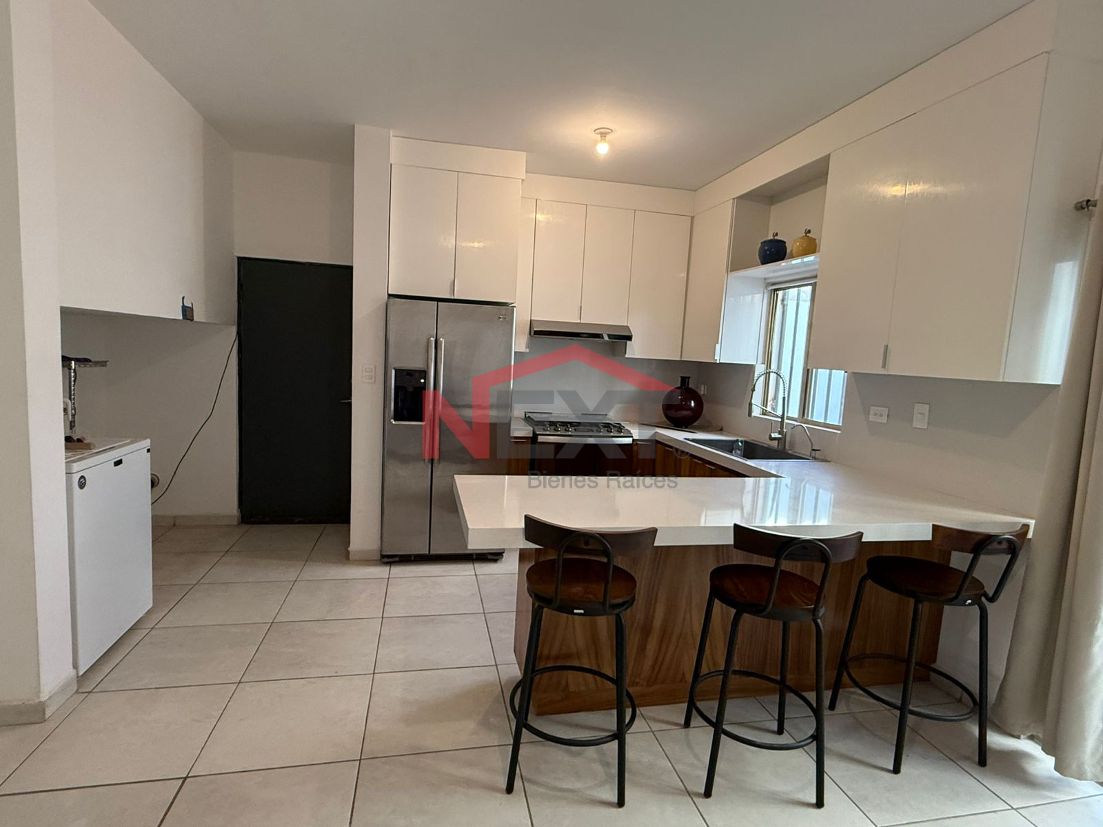 Casa de 2 plantas con 3 recámaras, principal con baño vestidor, 2.5 baños en total, elegante cocina con cubierta de cuarzo equipada con refrigerador y estufa, área de lavandería, 3 minisplits y patio con adoquín.