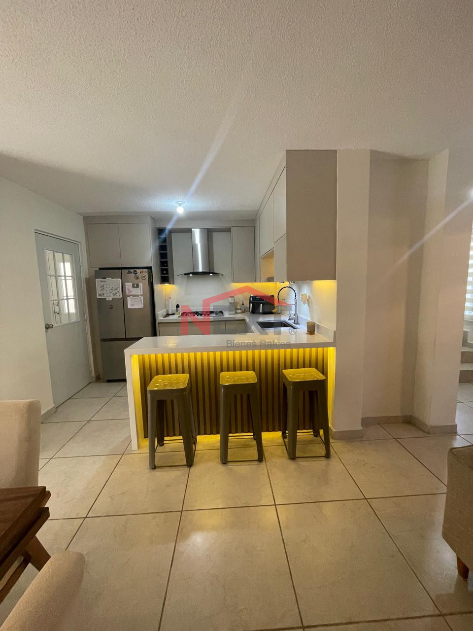 Cocina integral de melamina con cubierta de cuarzo, campana, placa de 5 quemadores, microondas, refrigerador.