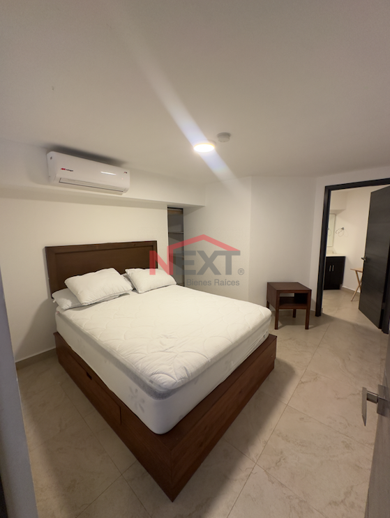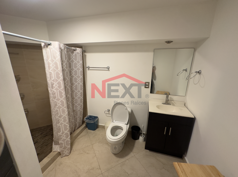 Cuenta con sala con sofá cama tipo love seat, cocina integral equipada con refrigerador, parrilla eléctrica, campana y tarja, así como escritorio para área de trabajo.