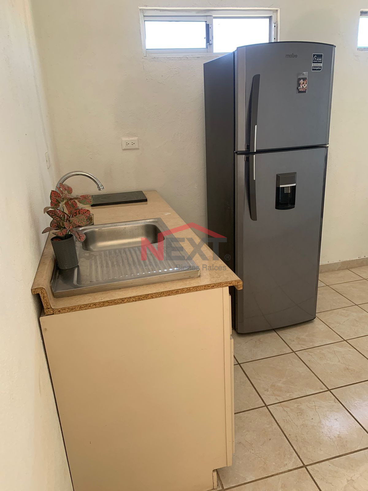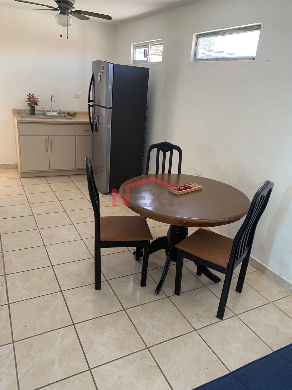 ♦️ cocina equipada con refrigerador, comedor con tres sillas y un abanico de techo