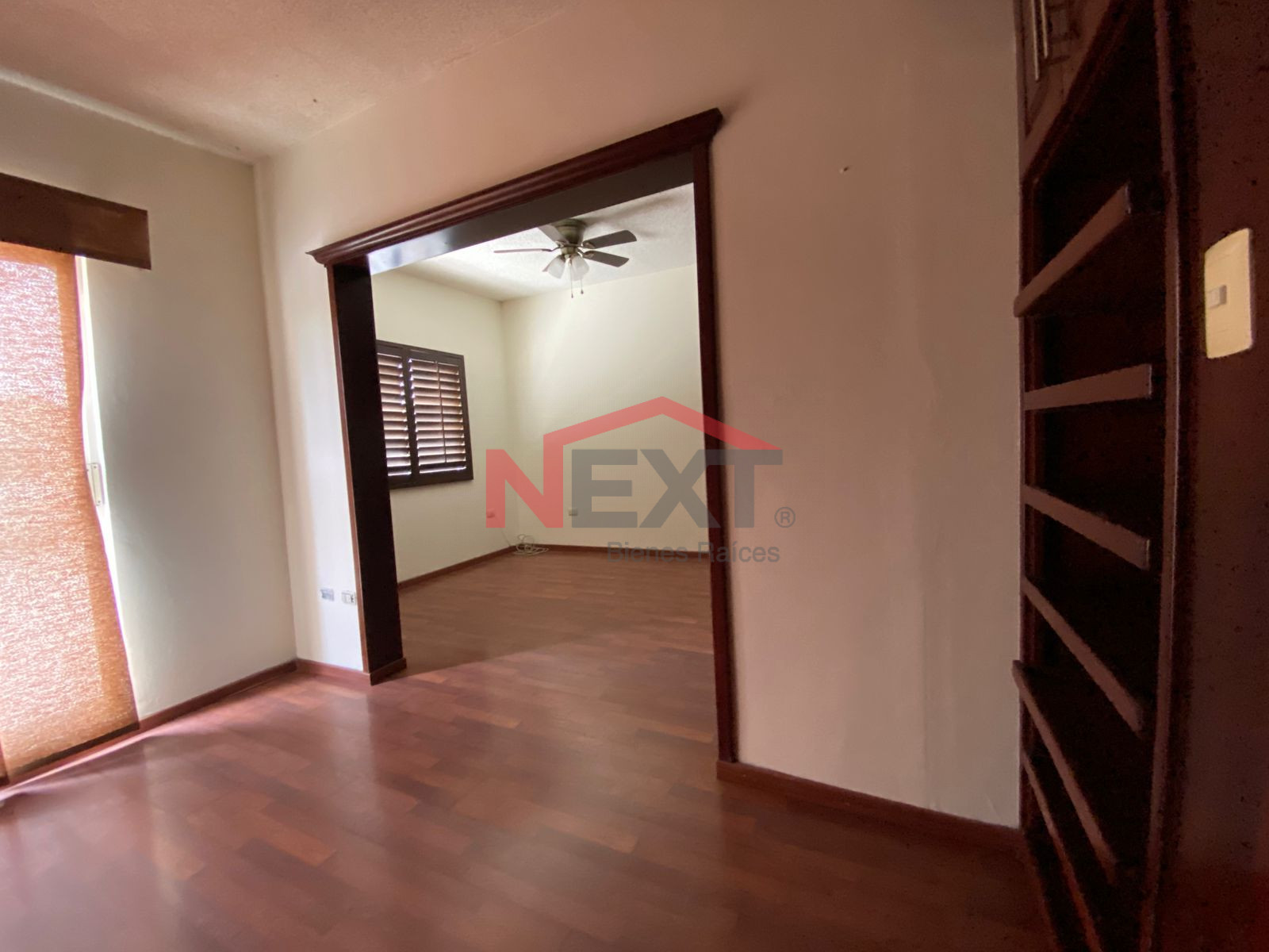 sala, comedor, cocina, 2 recamaras, una en planta baja, un baño y medio. Cuenta con s acabados pisos de laminado y madera.