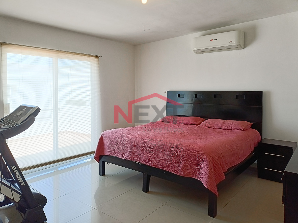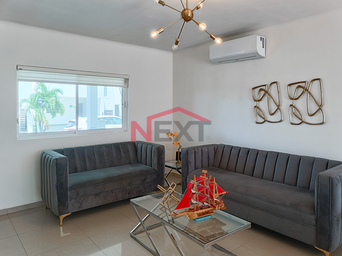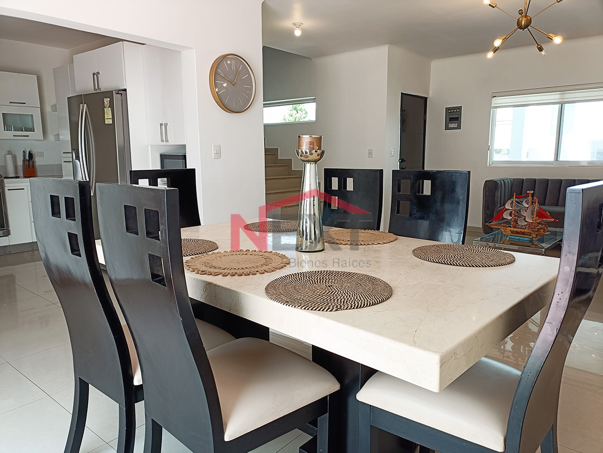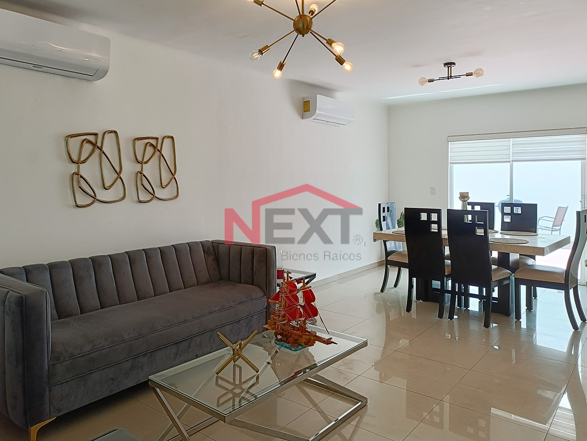 Casa de dos pisos, amueblada y equipada con paneles solares ubicada en fraccionamiento con acceso controlado y localizada muy cerca de escuelas y de la playa.