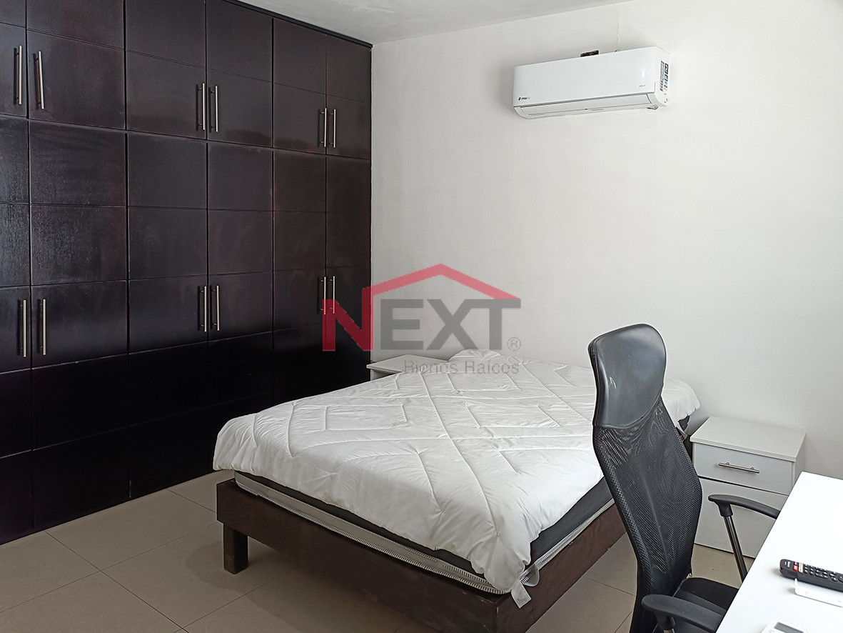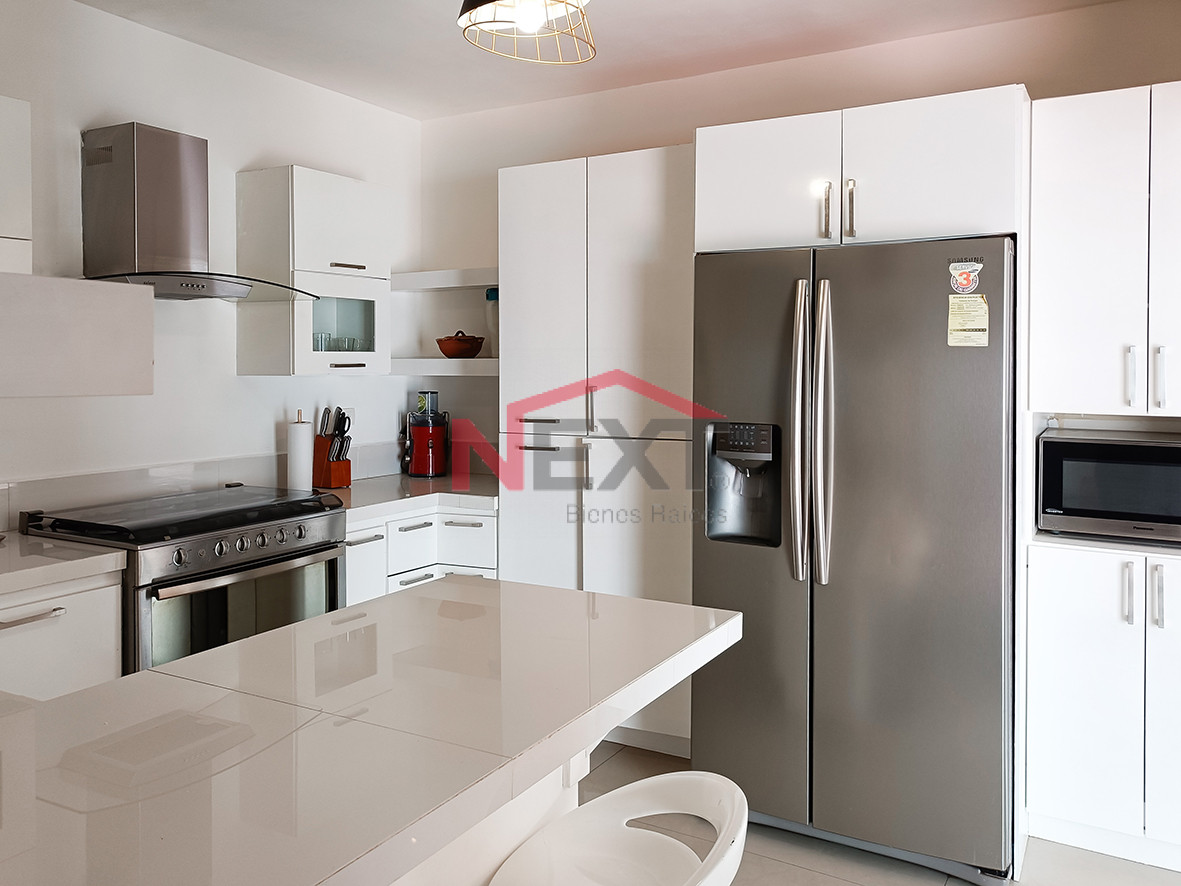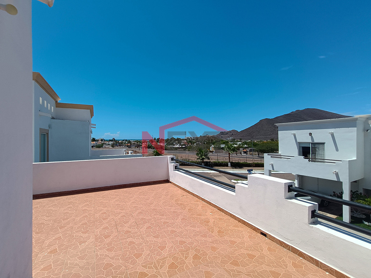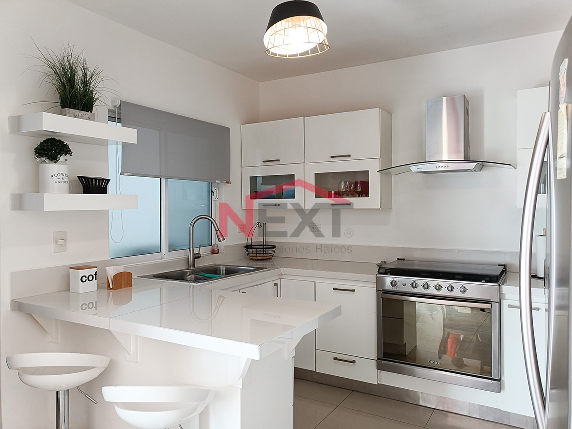 Casa de dos pisos, amueblada y equipada con paneles solares ubicada en fraccionamiento con acceso controlado y localizada muy cerca de escuelas y de la playa.