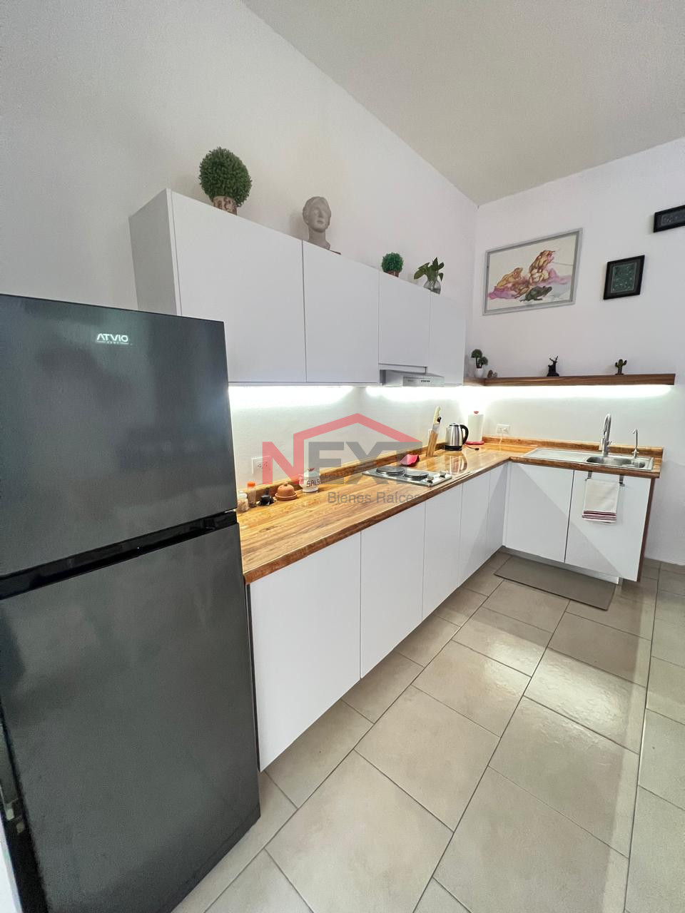 • Cocina equipada, con refrigerador, campana, placa eléctrica, microondas, filtro de agua
