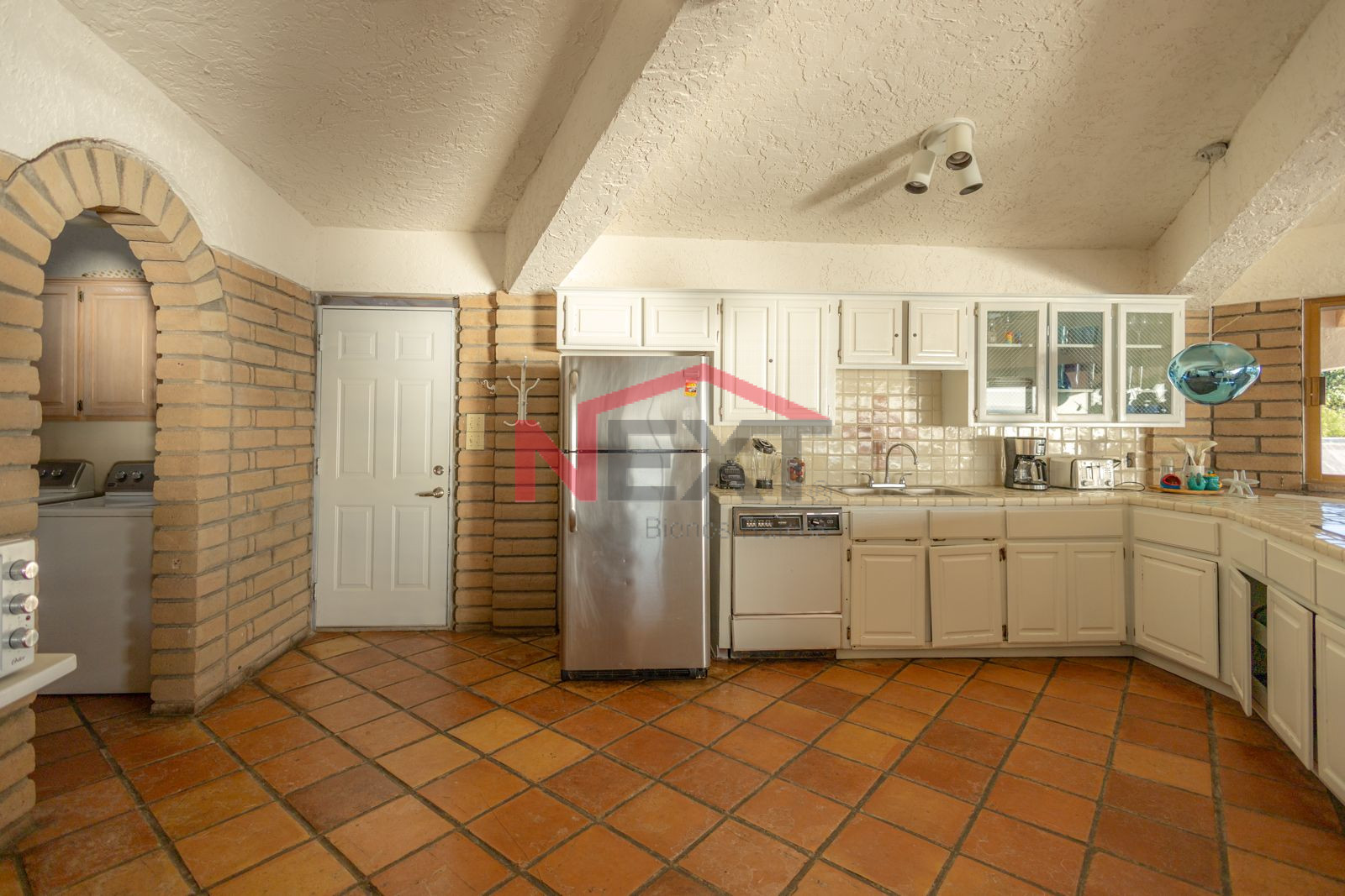 Cocina equipada con refrigerador, estufa, microondas, alacena y superficie en formica