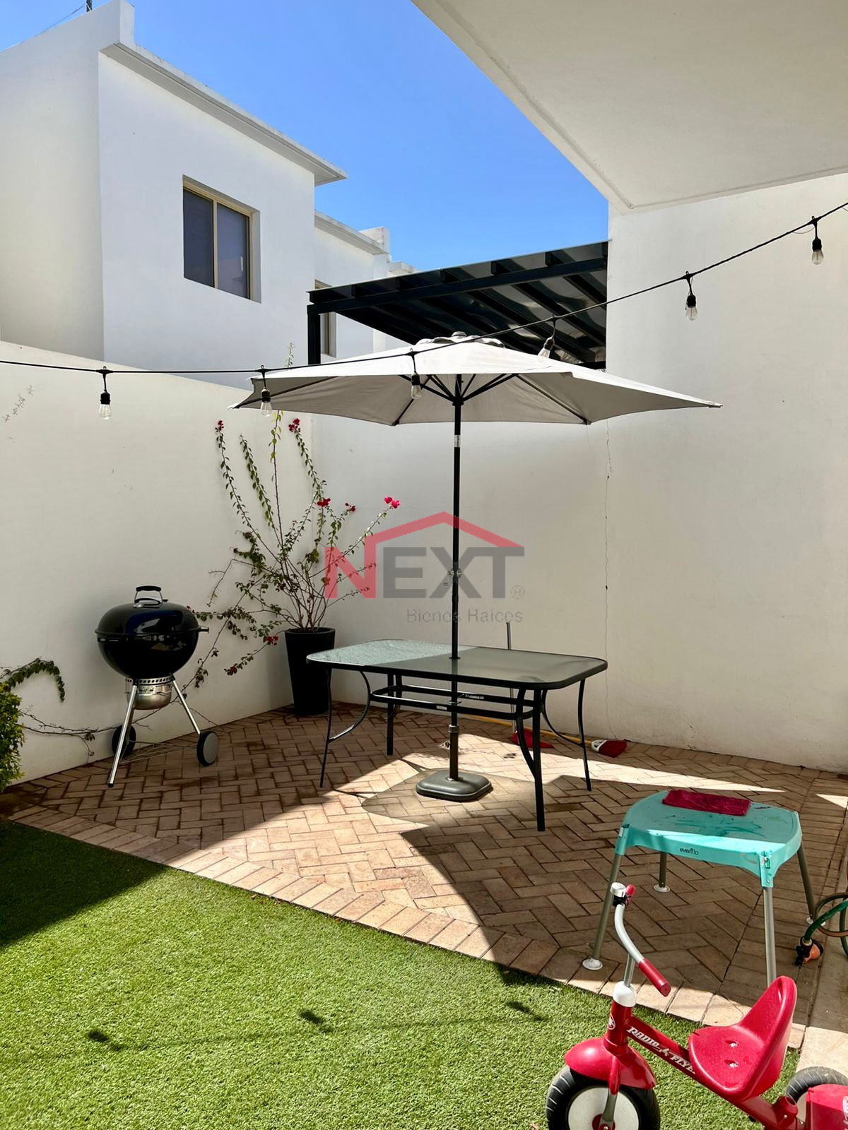 Jardín con pasto sintético y adoquín