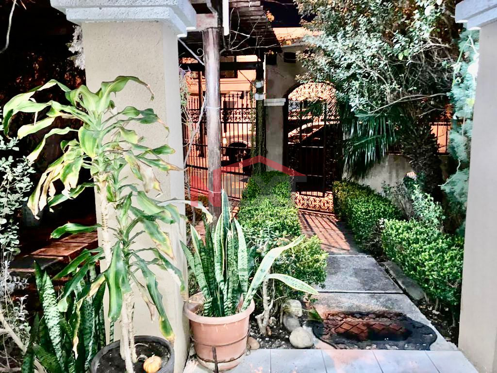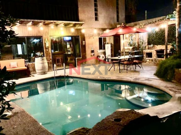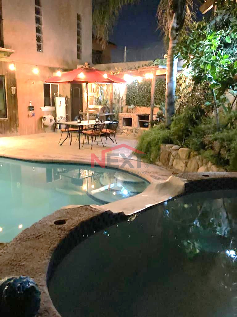 – Patio trasero con alberca y fuente decorativa