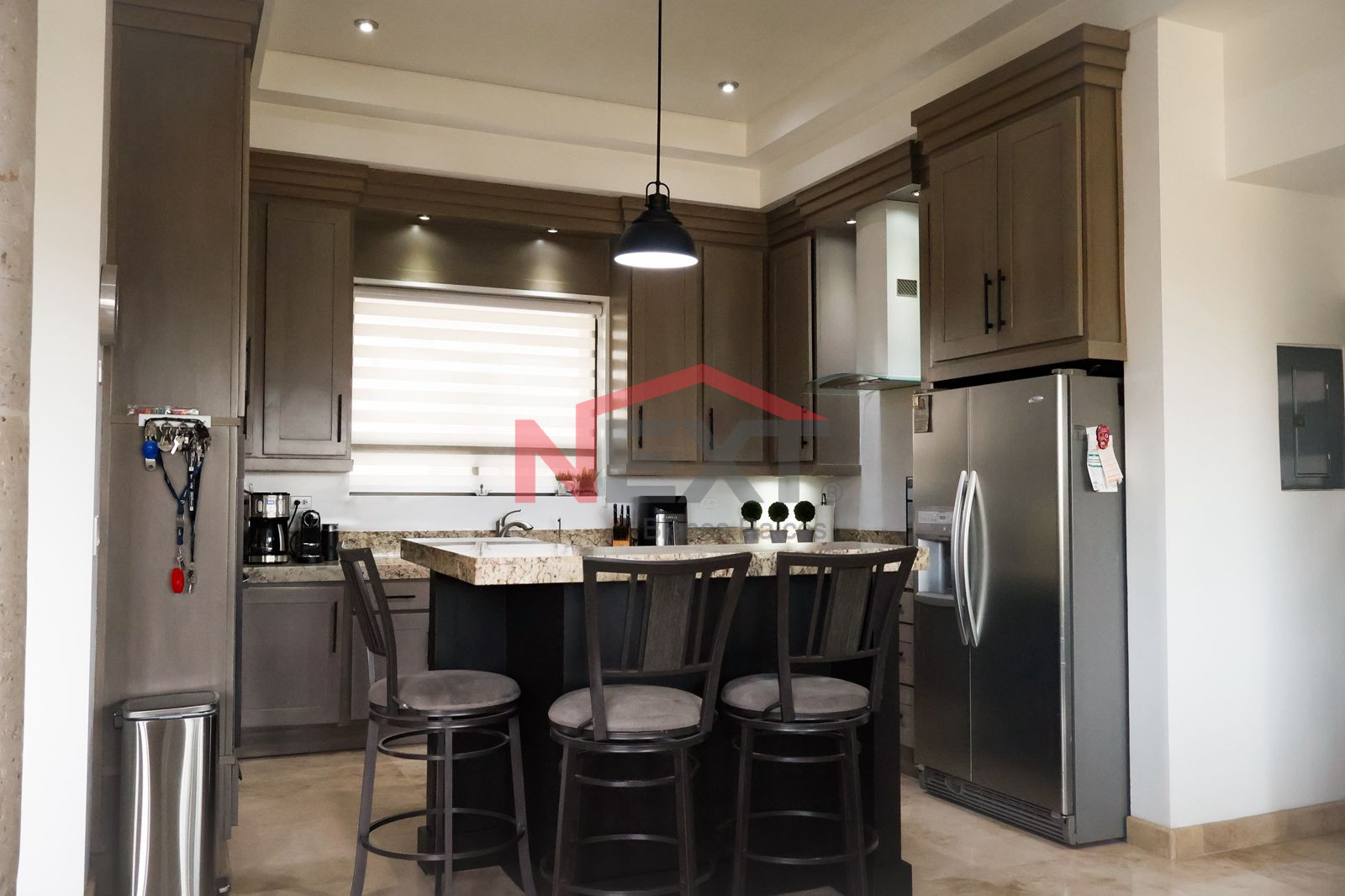 Cocina equipada con: refrigerador, horno, estufa y campana.