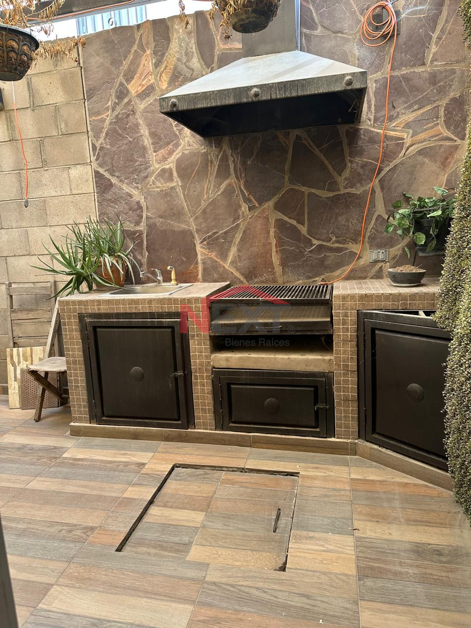 Área de asador interior con su asador, campana, techado con estructura y malla sombra.