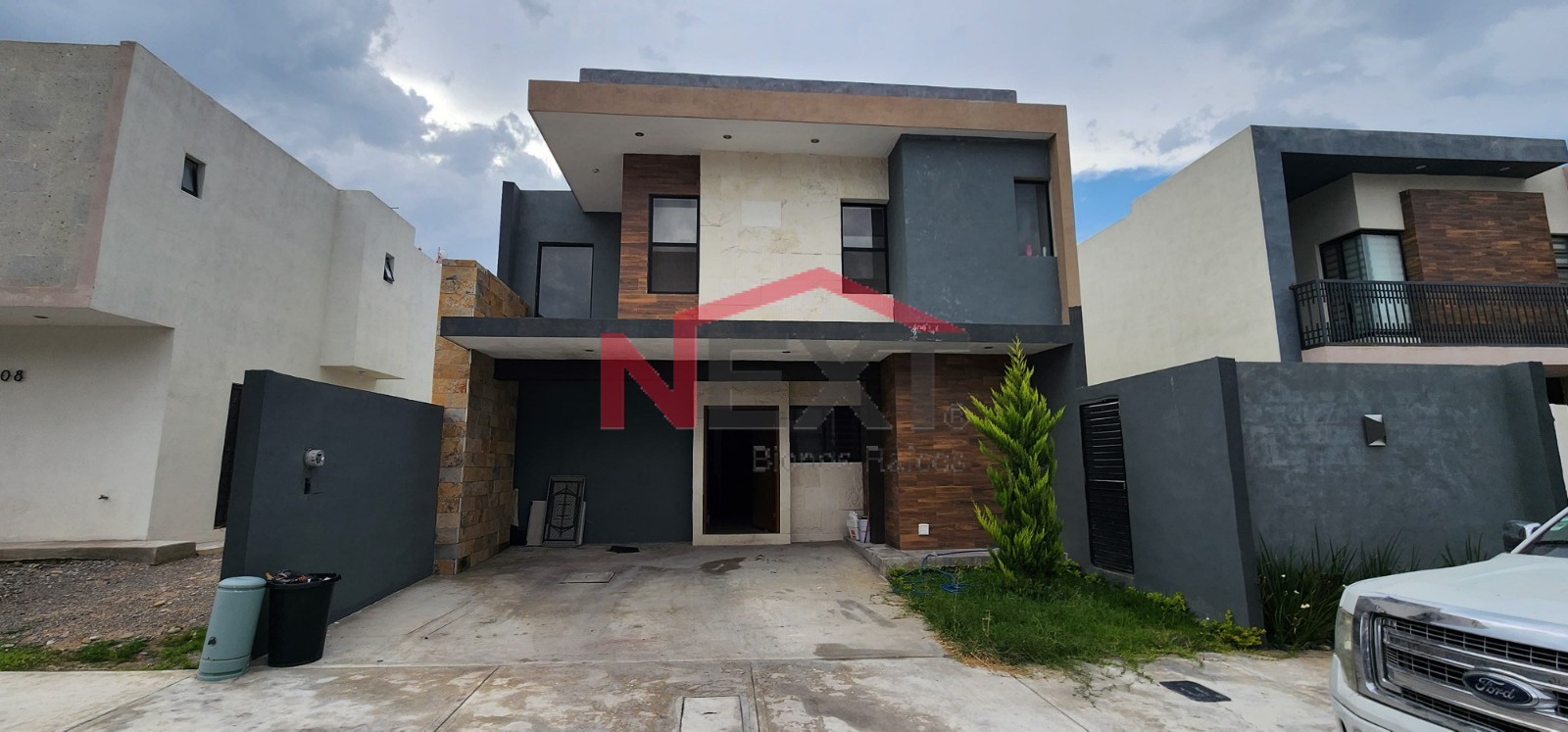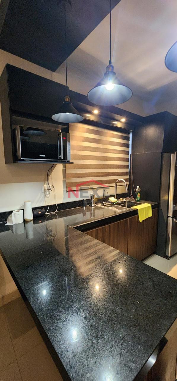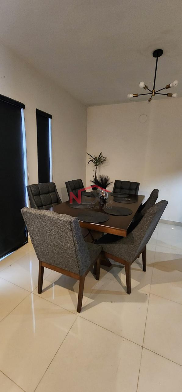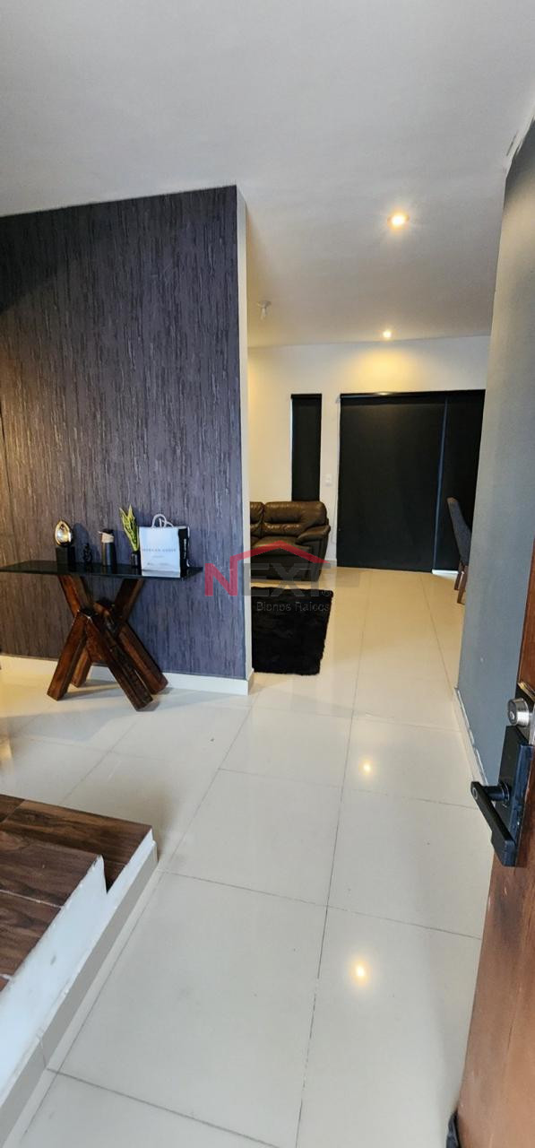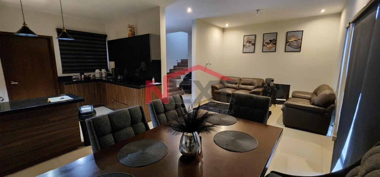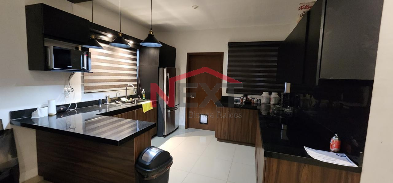 Cochera techada para dos autos, recibidor, sala-comedor, cocina equipada con cubierta de granito, desayunador y parrilla eléctrica.