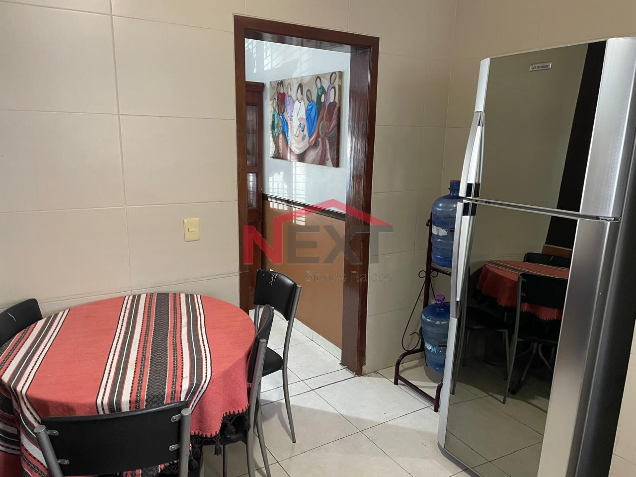 Cocina con refrigerador, campana, alacena y microondas