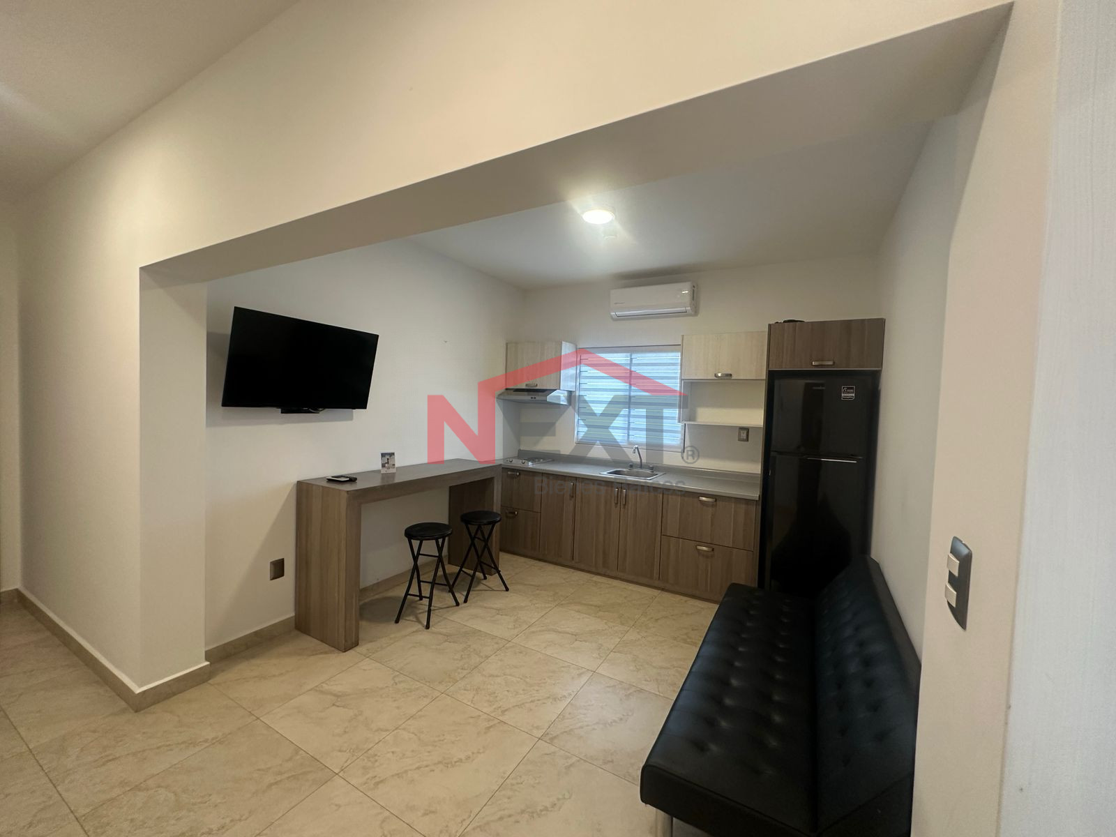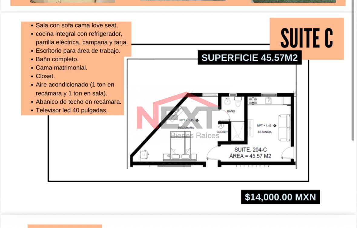 Incluye sala con sofá cama tipo love seat, cocina integral equipada con refrigerador, parrilla eléctrica, campana y tarja, además de escritorio para área de trabajo.