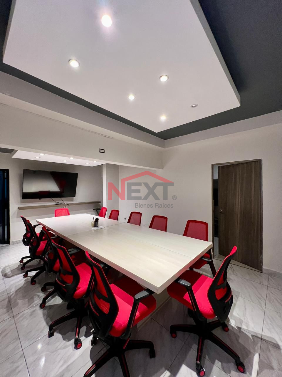 - Sala de juntas, espacio para 12 personas, con pantalla plasma para reuniones y mobiliario apto, medio baño