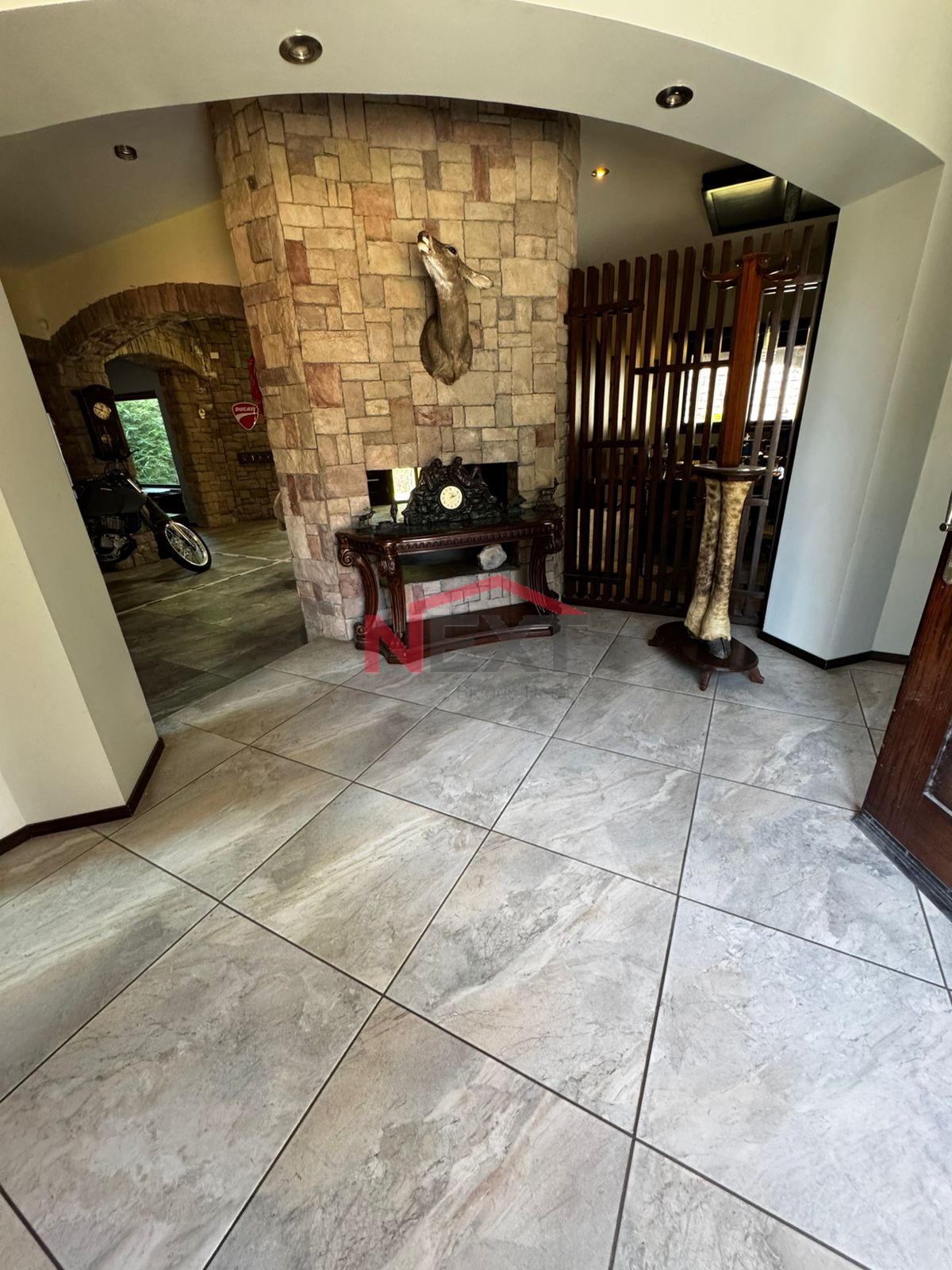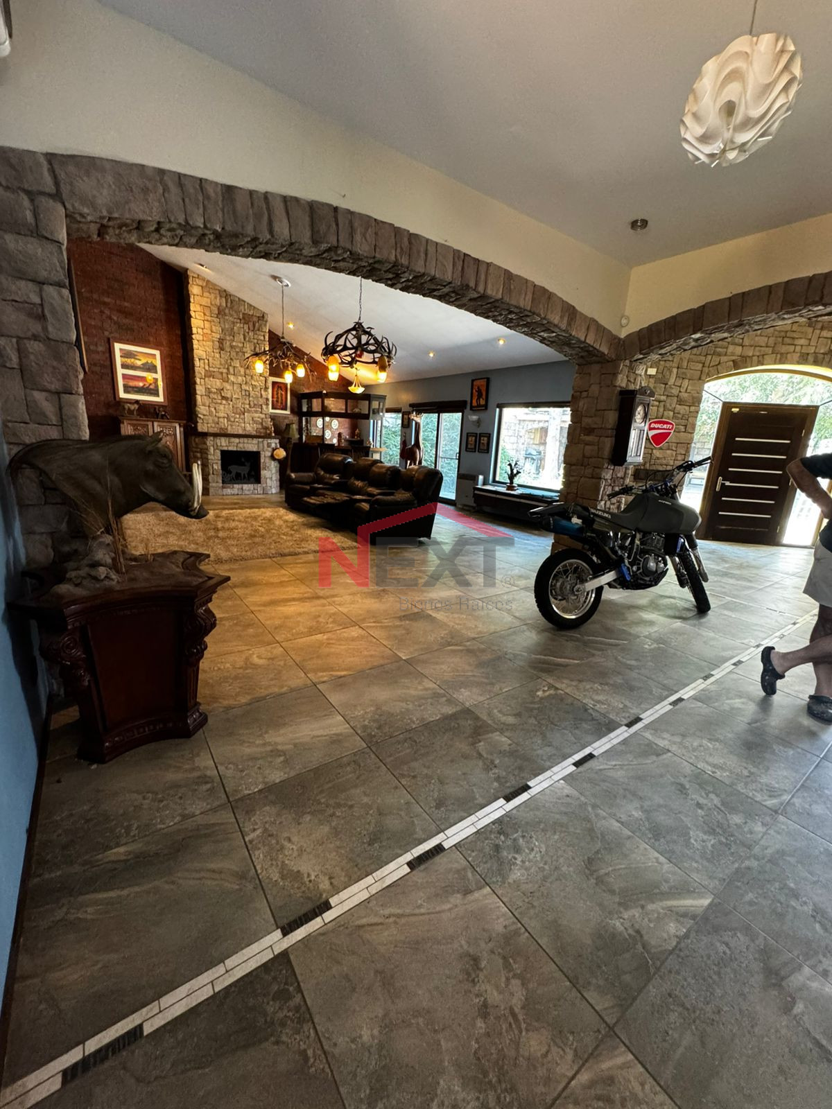 * Acceso Principal: Jardín frontal con cochera para 2 autos y una imponente chimenea central de cuatro caras que conecta visualmente la entrada, el comedor principal, la sala y el comedor diario.